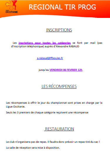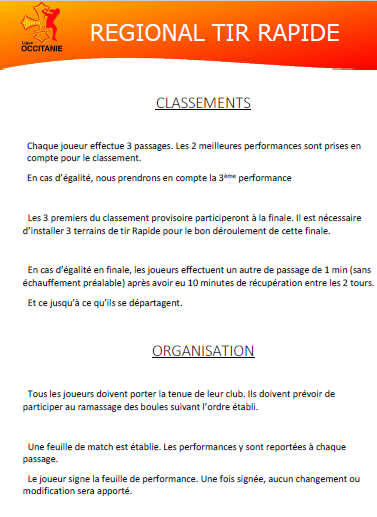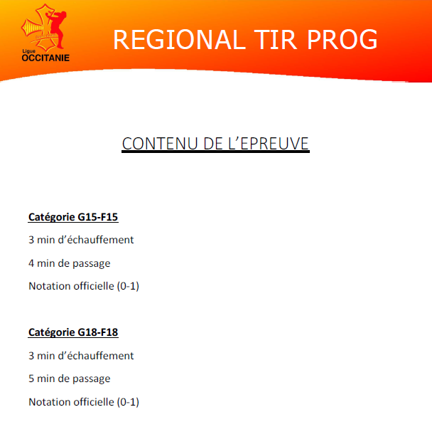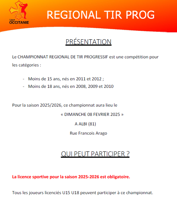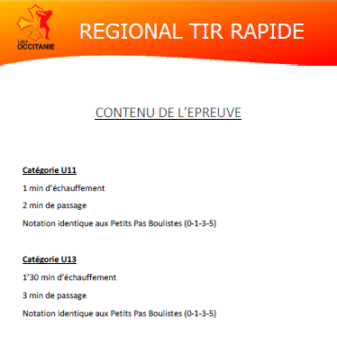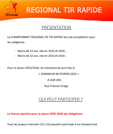 VOUS TROUVEREZ CI JOINT LE CAHIER DES CHARGES DU CHAMPOINNAT OCCITANIE TIR RAPIDE U11- U13 ET TIR PROGRESSIF U15 – U18 QUI SE DÉROULERA À ALBI LE 8 FEVRIER 2026